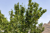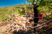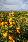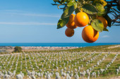 Pomarańczowi zbieracze w pracy na Sycylii, góra Etna w tle