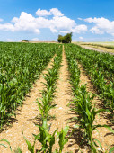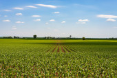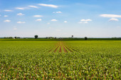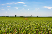 Rzędy kukurydzy w piękne wiosenne popołudnie na wsi Illinois.