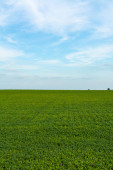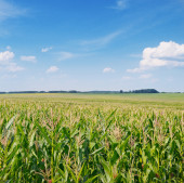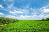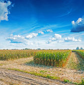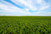 Rzędy kukurydzy w piękne wiosenne popołudnie na wsi Illinois.