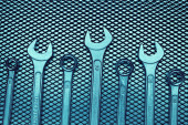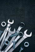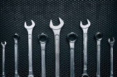 Zestaw kluczy chromowanych na stalowej powierzchni. Narzędzia mechaniczne do konserwacji. Narzędzia do naprawy. Kontekst narzędzi technicznych