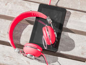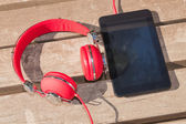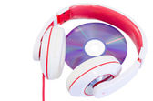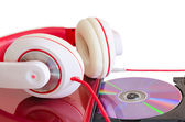 komputer przenośny z płyty dvd i czerwone białe słuchawki