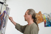 Artysta pracujący nad malarstwem. Człowiek artysta malarz w kreatywnym studio jako koncepcja sztuki