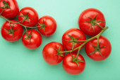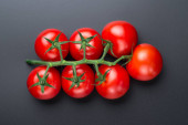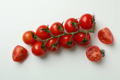 Świeża gałąź pomidora wiśniowego na czerwonym tle