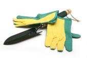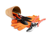 Rękawice i narzędzia ogrodnicze izolowane na białym tle