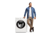 Portret młodego mężczyzny w garniturze opierającego się na pralce odizolowanej na białym tle