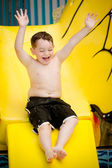 Szczęśliwe niemowlę bawiące się w basenie siedząc na dziecięcej platformie z baldachimem