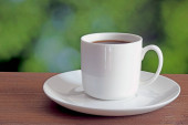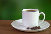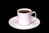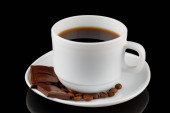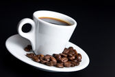 Czarna kawa w białym kubku z paloną ziarnką kawy na spodku izolowane na czarnym tle
