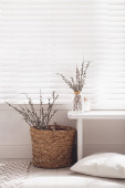 Glass vase with pussy willow tree branches on floor in room