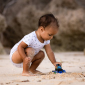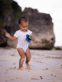 Słodka dziewczynka siedząca na piaszczystej plaży, bawiąca się piaskową miarką. Szczęśliwego dzieciństwa. Wakacje. Wakacje nad morzem. Dziewczynka w niebieskich strojach kąpielowych. Plaża Pandawa, Bali, Indonezja