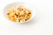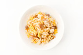 Sałatka ziemniaczana z korniszonami, jajkiem i musztardą izolowana na białym tle