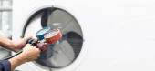 Zdjęcie "Kaukaski technik w jego 40-tych napraw popsuł pralkę. Konserwacja urządzeń domowych." może być wykorzystywane do celów osobistych i komercyjnych zgodnie z warunkami zakupionej licencji Royalty-free. Obraz jest dostępny do pobrania w jakości wysokiej rozdzielczości do 5760x3840.