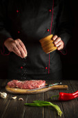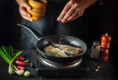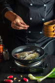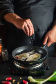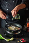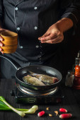 Szef kuchni przygotowuje świeże ryby na patelni z olejem. Przygotowanie do gotowania pokarmu dla ryb. Środowisko pracy w kuchni restauracji lub kawiarni.