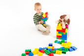 mały ładny chłopiec bawi się budulcem. na białym tle.