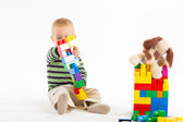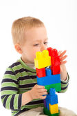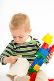 mały ładny chłopiec bawi się budulcem. na białym tle.