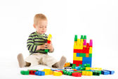 mały ładny chłopiec bawi się budulcem. na białym tle.