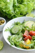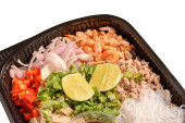Smaczne sałatka krewetki na zielonym tle, widok z góry