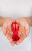 kadın kırmızı farkındalık şerit tutuyor
