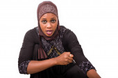 Muzułmańska dojrzała kobieta w okularach, stojąca i trzymająca kciuki na ustach.