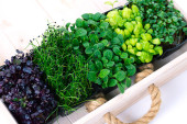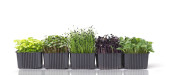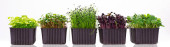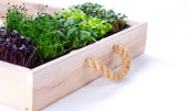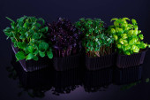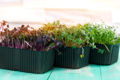 Mikrozielone rzodkiewki i cebule w plastikowych tacach na drewnianym tle vintage