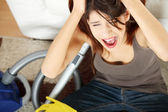 sfrustrowany młoda kobieta trzyma jej uszy