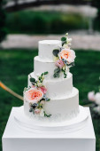 Zdjęcie "pyszne słodkie białe ciasto weselne z kwiatami" może być wykorzystywane do celów osobistych i komercyjnych zgodnie z warunkami zakupionej licencji Royalty-free. Obraz jest dostępny do pobrania w jakości wysokiej rozdzielczości do 5760x3840.