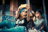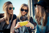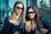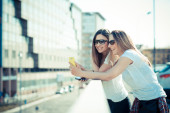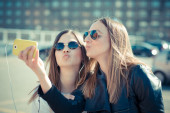 dwa piękne młode kobiety za pomocą inteligentnego telefonu selfie