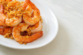smażone krewetki lub krewetki z czosnkiem na białym talerzu - owoce morza