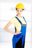 młoda kobieta w kask ochronny i młot pneumatyczny.