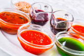 Zbliżenie na filiżanki pomidorów, sosy słodko-kwaśne, musztarda i pesto