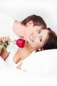 piękna brunetka kobieta budzi się w domu z prezentami i róża koło niej, przygotowane przez męża