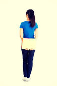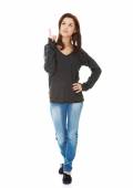 Zdjęcie "młoda kobieta przedstawia miejsce na jej dłoni" może być wykorzystywane do celów osobistych i komercyjnych zgodnie z warunkami zakupionej licencji Royalty-free. Obraz jest dostępny do pobrania w jakości wysokiej rozdzielczości do 5760x3840.