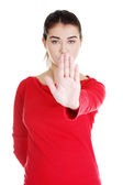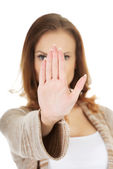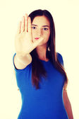 Trzymaj się, przestać gestem pokazał przez młoda kobieta