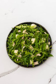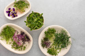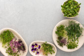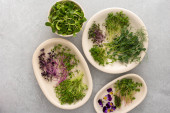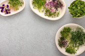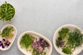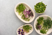 Różne rodzaje przydatnych mikrozieleni na płytach, widok z góry