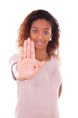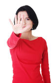 Trzymaj się, przestać gestem pokazał przez młoda kobieta