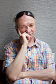 Portret przystojnego starszego mężczyzny rasy kaukaskiej w zegarku na rękę stojącego z laptopem na czarnej kamiennej ścianie