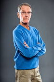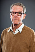 Portret poważnego starszego mężczyzny rasy białej z szarymi wąsami i zmarszczkami pochylającymi głowę na dłoni