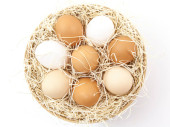świeże jaja w staromodny doniczka wypełnia siano na białym tle