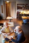 Piękna dojrzała kobieta z blond włosami siedzi przy stole i słucha chłopaka podczas randki w restauracji