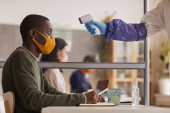 Zdjęcie "Szeroki kąt portret odnoszącego sukcesy afro-amerykańskiego biznesmena noszącego maskę podczas spaceru w kierunku kamery w biurowcu, przestrzeń kopiowania" może być wykorzystywane do celów osobistych i komercyjnych zgodnie z warunkami zakupionej licencji Royalty-free. Obraz jest dostępny do pobrania w jakości wysokiej rozdzielczości do 5760x3840.