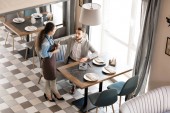 Uśmiechnięta, czuła, starsza kaukaska para siedząca razem na kanapie i obejmująca się, patrząc sobie w oczy w kawiarni.