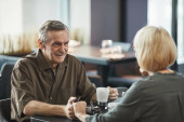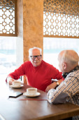 Pozytywny starszy biały mężczyzna siedzi przy stole i pije herbatę podczas rozmowy z przyjacielem w kawiarni podczas zbiórki