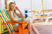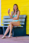 Wspaniała brunetka model bikini cieszy się lodami podczas relaksu w wiosennej pogodzie