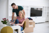 Uśmiechnięta para z laptopem siedząca na podłodze w nowym domu, pokazująca klucze