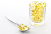 Omega 3 kapsułki leżące na białym tle. Olej rybny w tabletkach. Wsparcie zdrowotne i leczenie. Dodatki biologicznie czynne. Skupienie selektywne.