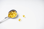 Omega 3 kapsułki leżące na białym tle. Olej rybny w tabletkach. Wsparcie zdrowotne i leczenie. Dodatki biologicznie czynne. Odbiór. Skupienie selektywne.