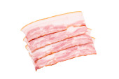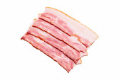 Surowe plastry bekonu odizolowane na białym tle. Widok z góry.