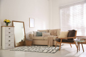 Zdjęcie "Stylowy salon z drewnianą drabiną w pobliżu białej ściany" może być wykorzystywane do celów osobistych i komercyjnych zgodnie z warunkami zakupionej licencji Royalty-free. Obraz jest dostępny do pobrania w jakości wysokiej rozdzielczości do 5760x3840.