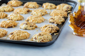 Taca w kratkę z kanadyjską flagą ciasteczka cukrowe z filiżanką kawy na białym tle.