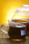 Francuska prasa ziołowe herbaty i Puchar zbliżenie na drewnianym stole