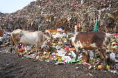 Krowy i psy szukające jedzenia w kupie śmieci, krowy jedzące na wysypisku śmieci.